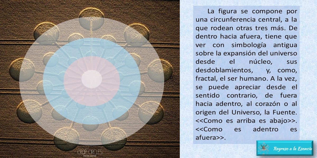 La figura se compone por una circunferencia central, a la que rodean otras tres más. De dentro hacia afuera, tiene que ver con simbología antigua sobre la expansión del universo desde el núcleo, sus desdoblamientos, y, como, fractal, el ser humano. A la vez, se puede apreciar desde el sentido contrario, de fuera hacia adentro, al corazón o al origen del Universo, la Fuente. <<Como es arriba es abajo>>. <<Como es adentro es afuera>>.