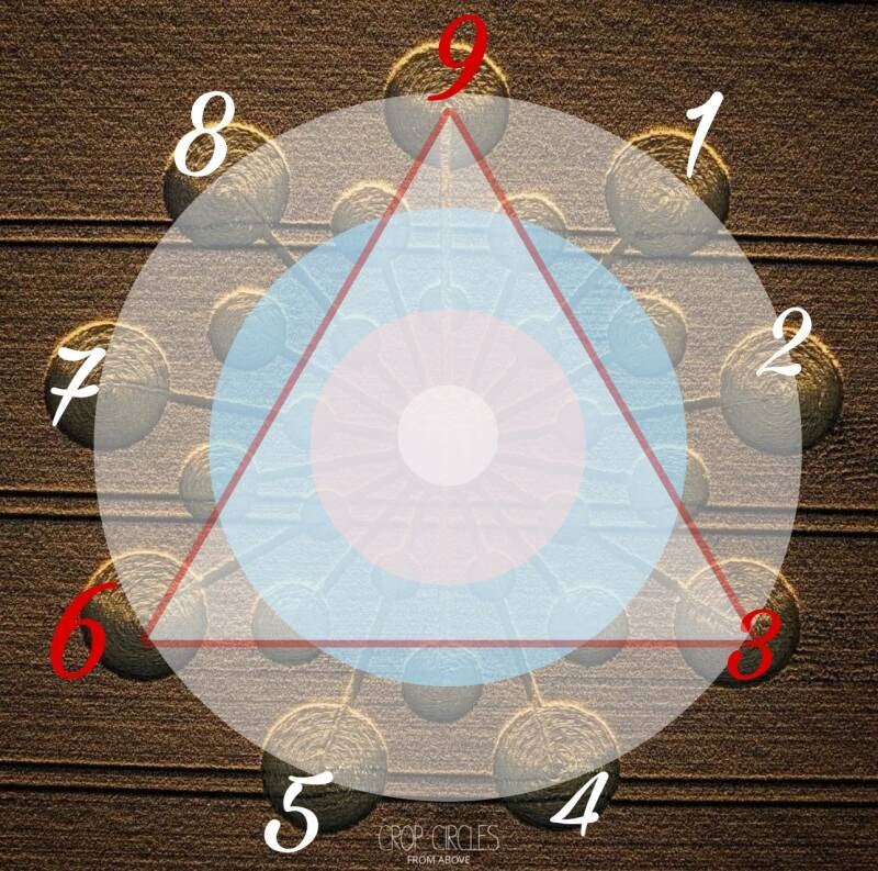 Cada circunferencia, formada por nueve círculos, configura tres triángulos. Tres veces tres. Un primer triángulo, una llama trina, es el primer tres, que se une a otra llama trina, otro tres, por lo que juntos forman el seis. Dan lugar a otra llama trina, lo que da lugar al nueve. Así se repite el 369 tres veces, una por cada circunferencia, como la forma de creación.
