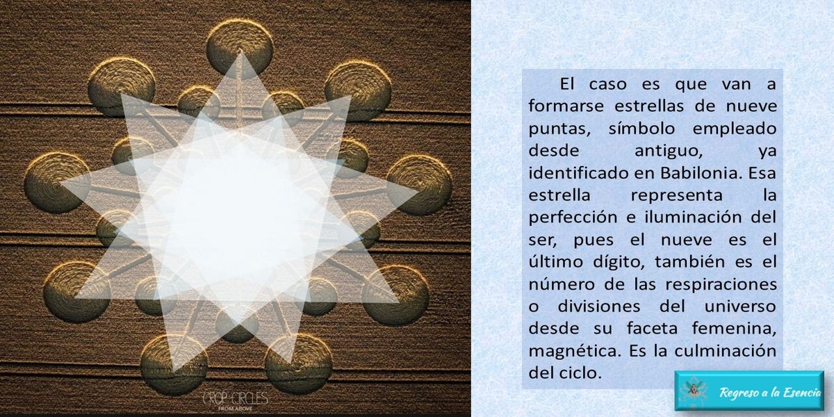 El caso es que van a formarse estrellas de nueve puntas, símbolo empleado desde antiguo, ya identificado en Babilonia. Esa estrella representa la perfección e iluminación del ser, pues el nueve es el último dígito, también es el número de las respiraciones o divisiones del universo desde su faceta femenina, magnética. Es la culminación del ciclo.